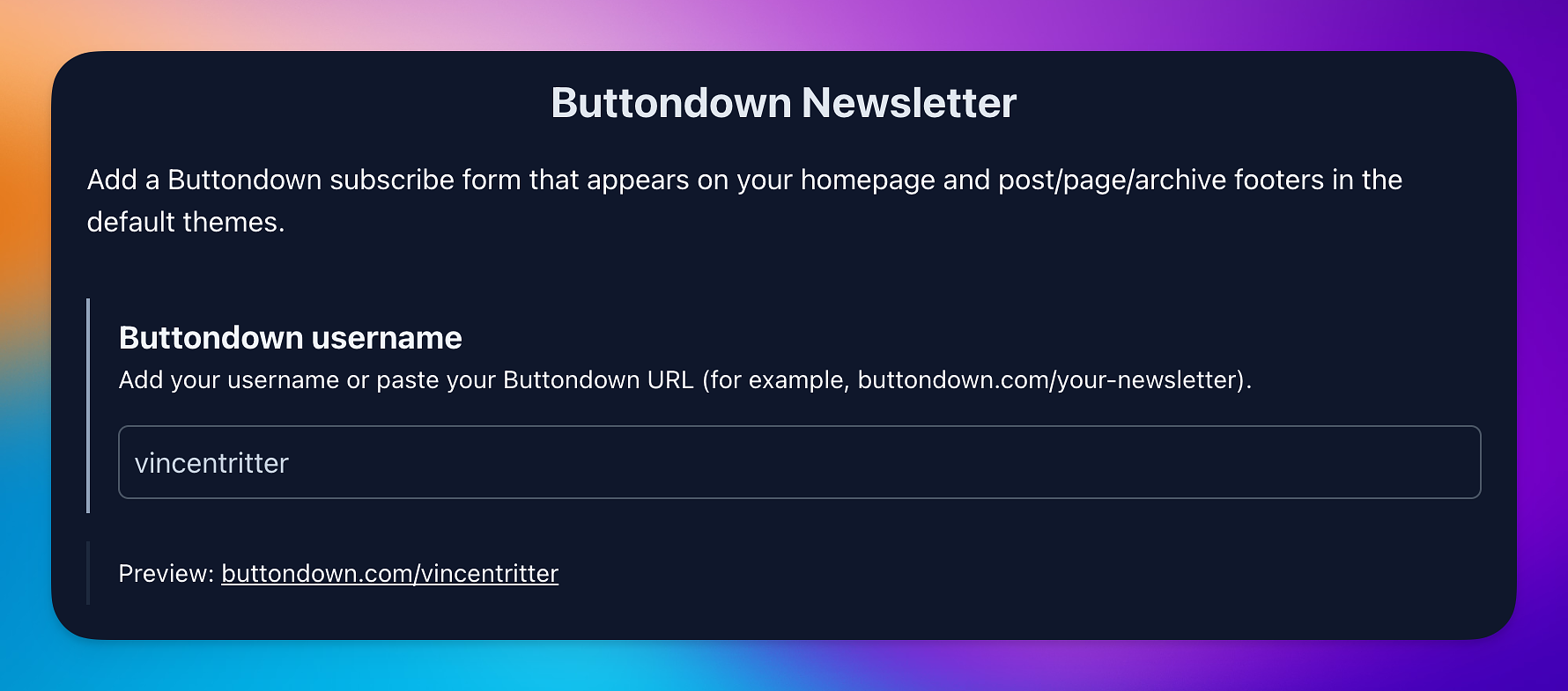 - ✌️ Added support for adding a Buttondown newsletter subscribe form to the footer of your website, just visit "Reply by Email, Newsletter & Form" on your blog settings page and set your username.