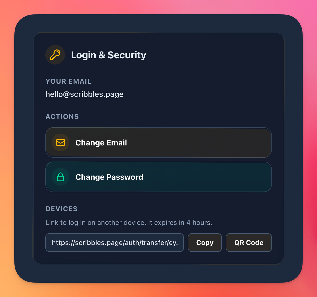 - š You can now transfer your session to another device, without having to enter your email & password. Just head on Login & Security, and you'll see the "Devices" section with a one time code to use. Don't share this of course. You can also scan a QR code on your phone and it will do it for you.
