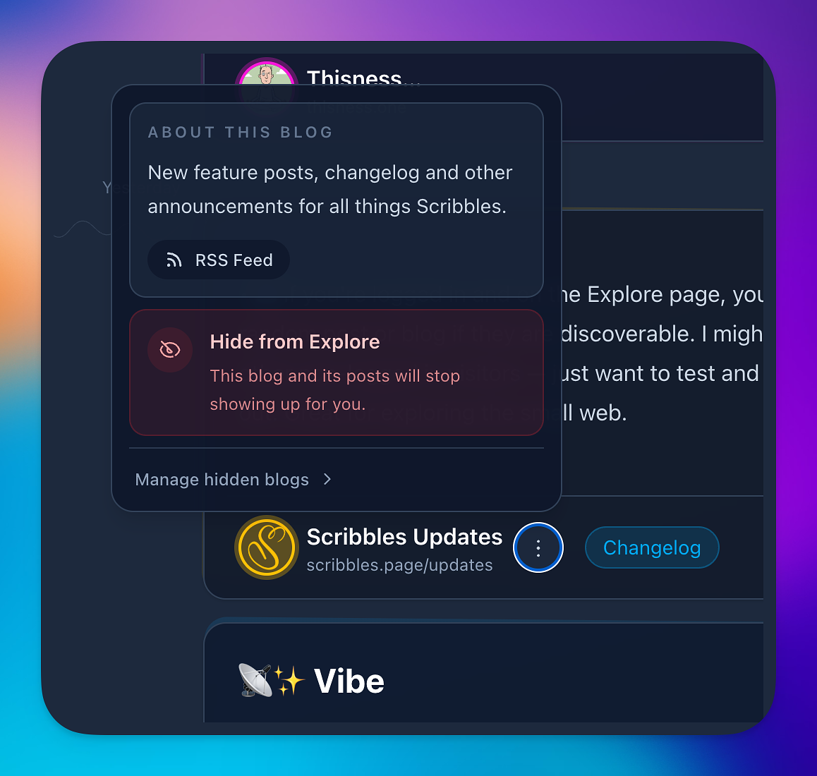 - ✨ Added a few options to the explore page, when logged in, that allows you to see more details about a given blog and also surface the RSS feed. In addition to this, you're now able to hide blogs that don't interest you — bring them back any time on your account page.